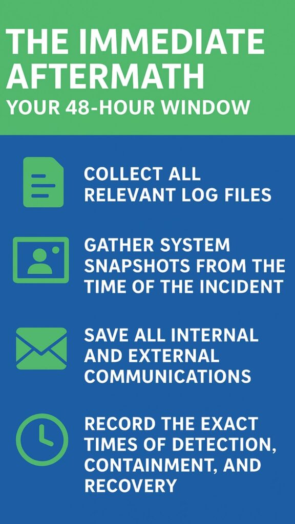 The first 48 hours after an incident are the best time to capture details while they’re still fresh. You should gather logs, system snapshots, alerts, messages, and all actions taken. Build a timeline of events from the first alert to recovery.