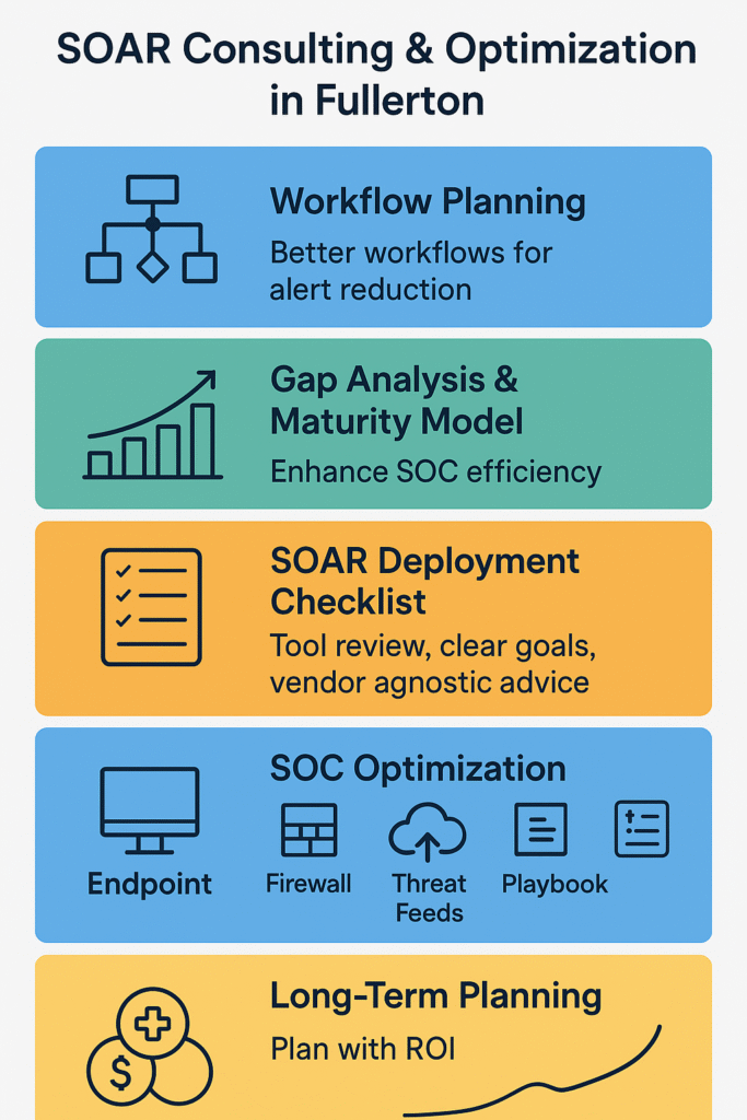 SOAR implementation consulting services in Fullerton help you plan better workflows. You get support with security orchestration automation response, incident response automation, threat detection integration, and SIEM SOAR connector setup. Consultants use gap analysis cybersecurity and the SOAR maturity model to find weak spots. This helps reduce alert fatigue and improve mean time to response reduction for your team.